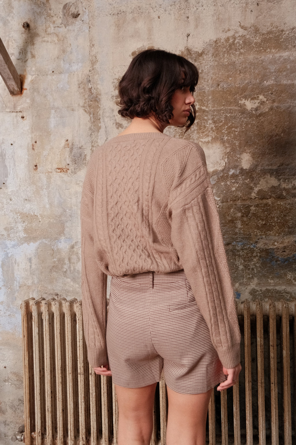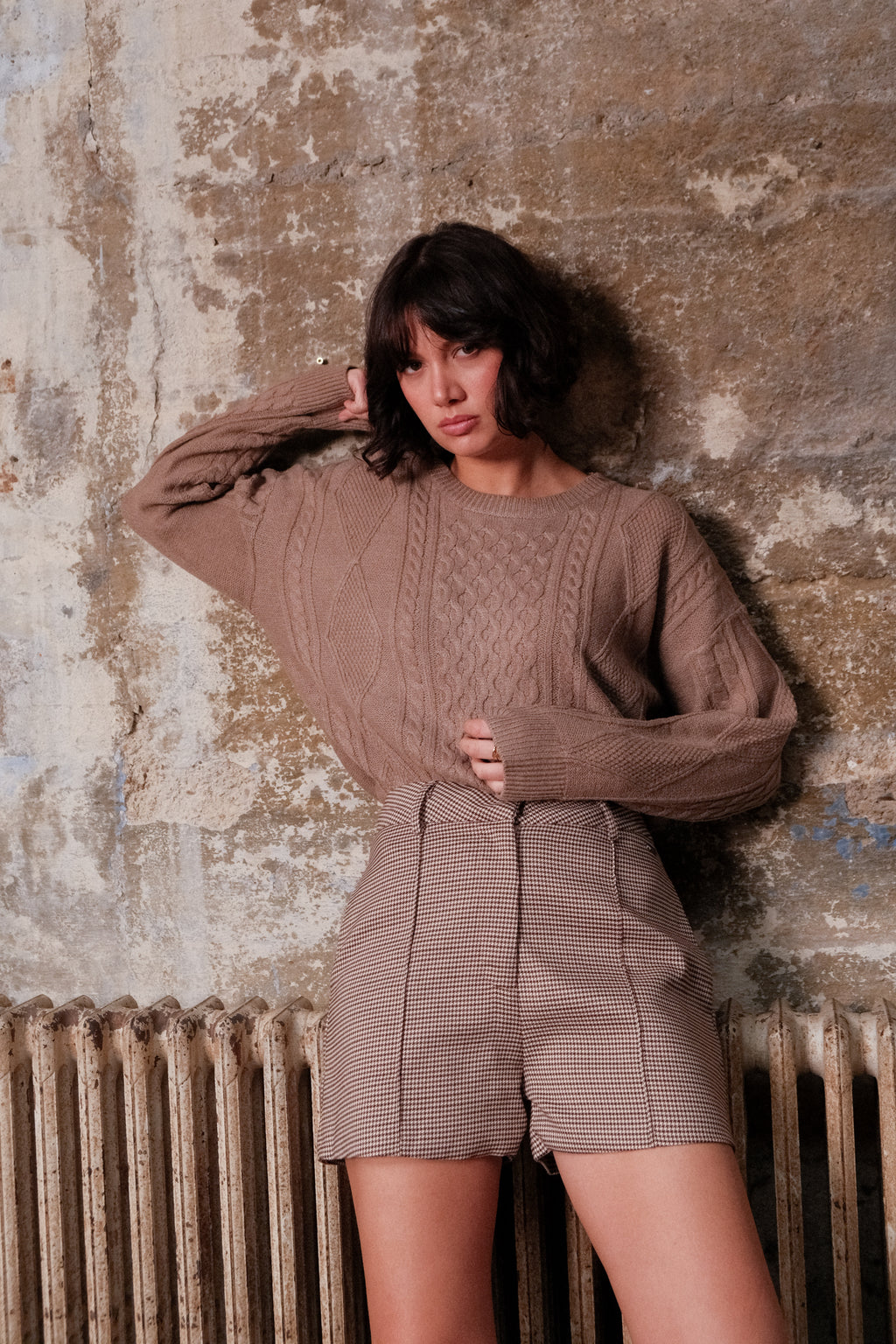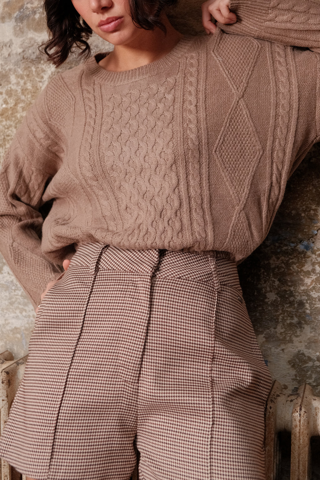 À associer avec un short à carreaux comme le short Velda pour un look coordonné, ou avec un jean, un pantalon tailleur ou une jupe midi pour une silhouette élégante et confortable. Parfait pour un style automnal ou hivernal misant sur la texture.